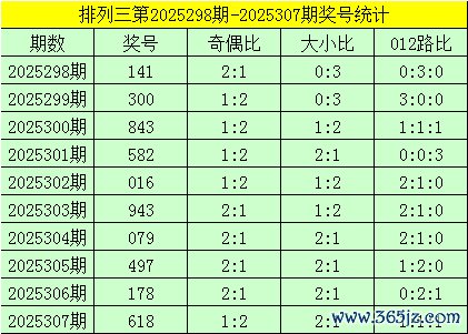 开奖总结:摆设三第2025307期奖号为:618,其奇偶比为1:2,大小比为2:1,奖号012路比为1:1:1。