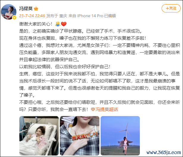 2023年7月,她发文败露确诊甲状腺癌,已完成手术,示意嗓子规复得差未几。“通过这个癌,我念念对大众说,尤其是女孩子们:一定不要精神内讧,不要往心里积压负能量,多跟家东谈主一又友相易交流,遭遇网络暴力和造黄谣,一定要勇敢说出来何况提起法律的火器保护我方。不要缅念念哦,之后我还要给你们唱歌呢,何况不久后咱们就会碰面啦,你还会来听吗?惟有你听,我就会一直唱下去!”